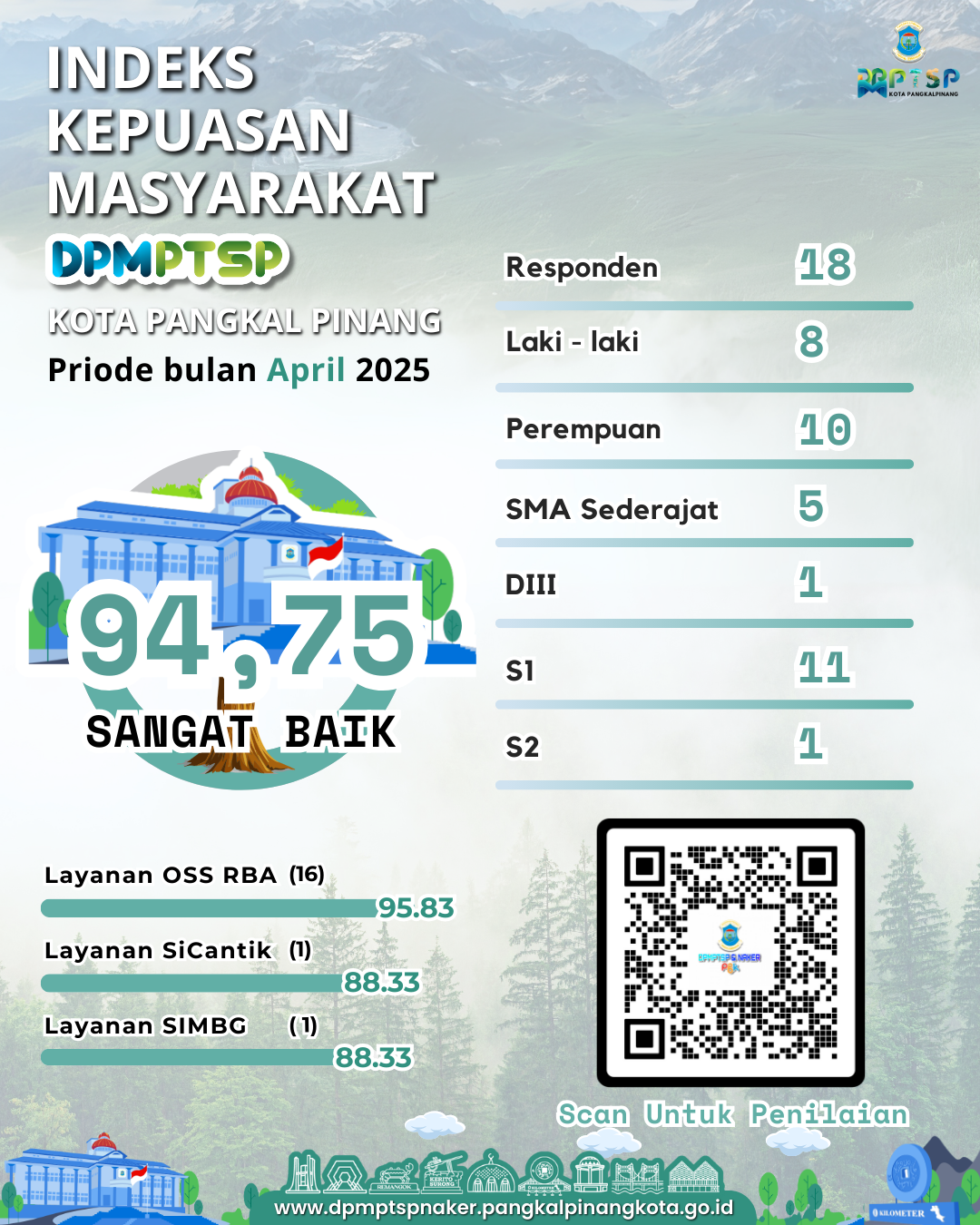 Pada bulan April 2025 terdapat 18 responden yang  mengisi Survei Kepuasan Masyarakat dari 3 layanan Perizinan Online yang ada di DPMPTSP Kota Pangkal Pinang yaitu OSS RBA untuk perizinan Berusaha 16 responden, SiCantik Cloud untuk Perizinan Profesi 1 responden dan SIMBG untuk Perizinan Bangunan Gedung 1 Responden dengan total Indeks Kepuasan masyarakat sebesar 94,75 point yang mendapatkan predikat Sangat Baik untuk mutu sebuah pelayanan DPMPTSP Bulan April Tahun 2025