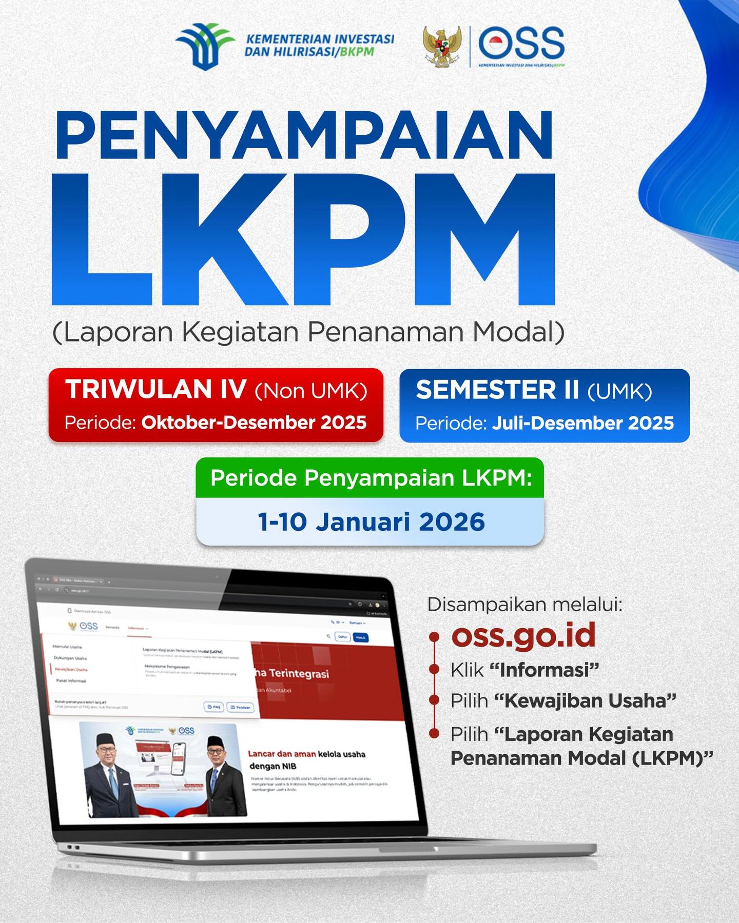 Waktu penyampaian sangat terbatas. Pastikan Anda tidak melewati tenggat waktu agar terhindar dari sanksi administratif berupa peringatan tertulis hingga pembekuan izin usaha. Periode Penyampaian LKPM: 1 – 10 Januari 2026!