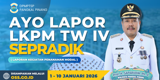 PANGKAL PINANG – Menutup tahun 2025 dengan kepatuhan adalah kunci sukses keberlanjutan usaha. Dinas Penanaman Modal dan Pelayanan Terpadu Satu Pintu (DPMPTSP) Kota Pangkal Pinang menghimbau kepada seluruh pelaku usaha di wilayah Kota Pangkal Pinang untuk segera mempersiapkan dan menyampaikan Laporan Kegiatan Penanaman Modal (LKPM).