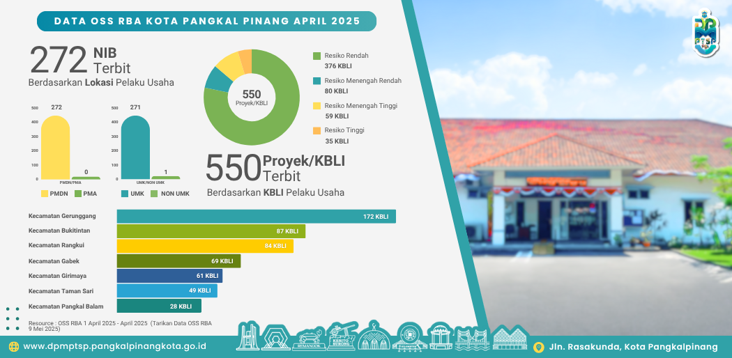 Dinas Penanaman Modal, Pelayanan Terpadu Satu Pintu Kota Pangkal Pinang melalui sistem Online Single Submission (OSS) telah menerbitkan 272 Nomor Induk Berusaha (NIB) pada Bulan April 2025. Komposisi dari NIB yang telah terbit terdiri dari 271 Usaha Mikro dan Kecil (UMK) dan 1 Usaha Besar (Non UMK)