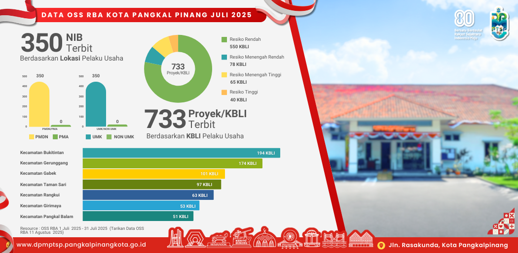 Dinas Penanaman Modal, Pelayanan Terpadu Satu Pintu Kota Pangkal Pinang melalui sistem Online Single Submission (OSS) telah menerbitkan 350Nomor Induk Berusaha (NIB) pada Bulan Juli 2025. Komposisi dari NIB yang telah terbit terdiri dari 350 Usaha Mikro dan Kecil (UMK) dan 350 Penanaman Modal Dalam Negeri (PMDN)