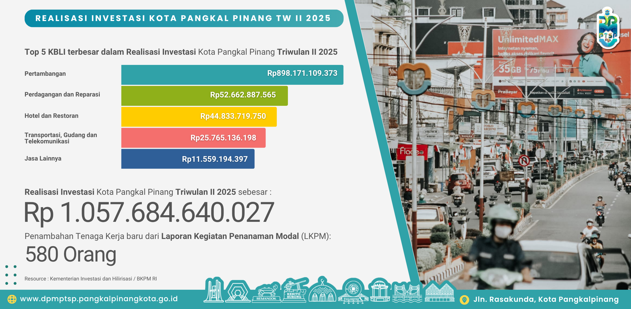 Dinas Penanaman Modal Kota Pelayanan Terpadu Kota Pangkal Pinang Tahun merilis TOP 5 KBLI yang mengukuhkan realisasi investasi terbesar untuk priode Laporan Kegiatan Penanaman Modal (LKPM) Triwulan II Tahun 2025, adapun TOP 5 KBLI tersebut sebagai berikut: